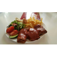 coaste de porc,cartofi prajiti,mix salata,sos barbeque