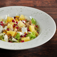 salată, piept de pui, ananas, porumb, rodie, sos iaurt