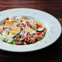 saláta, csirkemell, bacon, főtt tojás, paradicsom, parmezán, dijoni mustáros öntet