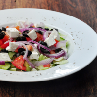 salată, ton, roșii, porumb, ceapă, ou fiert, măsline verzi, sos maioneză