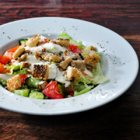 salată, piept de pui, roșii, castraveți, crutoane, parmezan, sos cezar