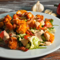 saláta, rukkola saláta, csirkemell, kukoricapehely, bacon, paradicsom, uborka, mayo rose öntet