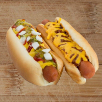 2 bucăţi de Hot-Dog: Cemvurști + Ceapă prăjită + Muștar + Ketchup + 200g Cartofi prăjiţi
